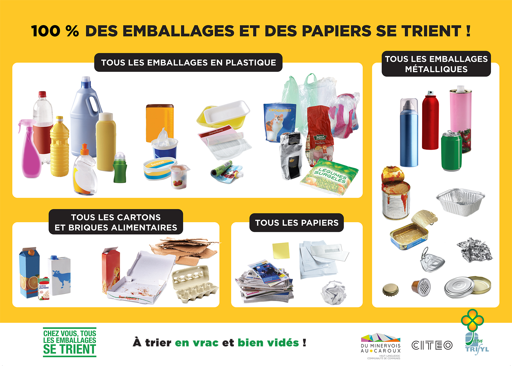 Ces nouvelles consignes de tri sont identiques sur tout le territoire français. Où que vous alliez, vous triez tous les emballages et tous les papiers dans un même bac.
